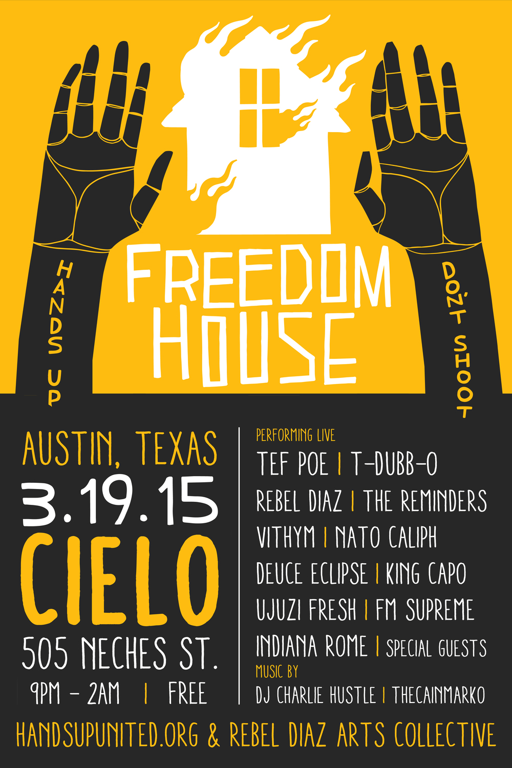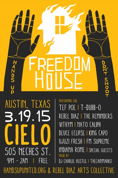 Bringing to the forefront some of the leading artists who have been on the front lines in the streets and in the struggles in Ferguson, The South Bronx, Chicago, Milwaukee and beyond The Freedom House Showcase aims to provide a space for liberation and protest music. Brought to you by Hands Up United and Rebel Diaz Arts Collective, this powerful showcase aims to unite the movement that has been set ablaze after the killing of Mike Brown. Just when you thought the party at Austin was getting too corporate, #FreedomHouse will inspire festival goers to stand up, speak on issues and party at the same time.