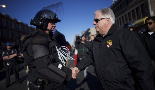 Photo: Maryland Governor Larry Hogan greets Baltimore police dressed in riot gear the morning after citywide riots following the funeral of Freddie Gray (Mark Makela/Getty)