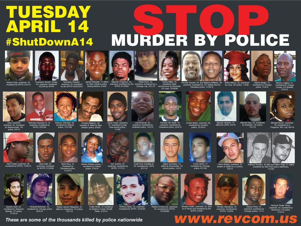 On Tuesday April 14, we will take our movement to STOP wanton killing by police to a whole new level. NO SCHOOL! NO WORK! STOP BUSINESS AS USUAL! Say no more to the system giving a green light to killer cops!