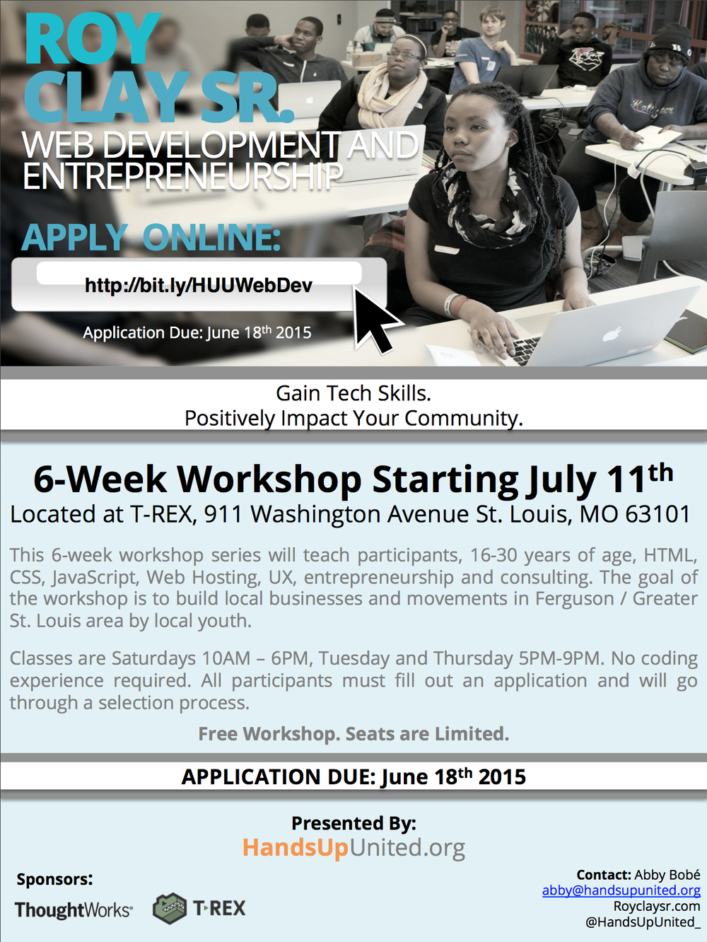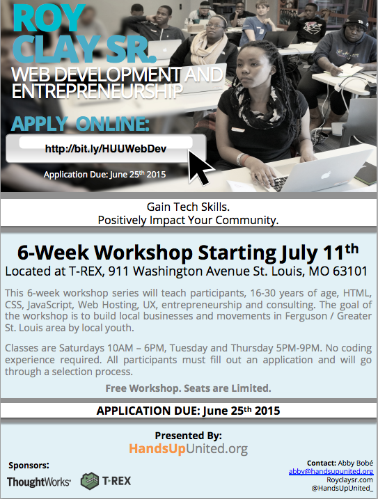 We are excited to launch our second cohort for The Roy Clay Sr. Web Development and Entrepreneurship 6-Week Workshop starting on July 11th, 2015. This workshop series will consist of teaching local St. Louis aged 16 - 30 skill sets in HTML, CSS, JavaScript, Web Hosting, User Design, Entrepreneurship and Consulting.