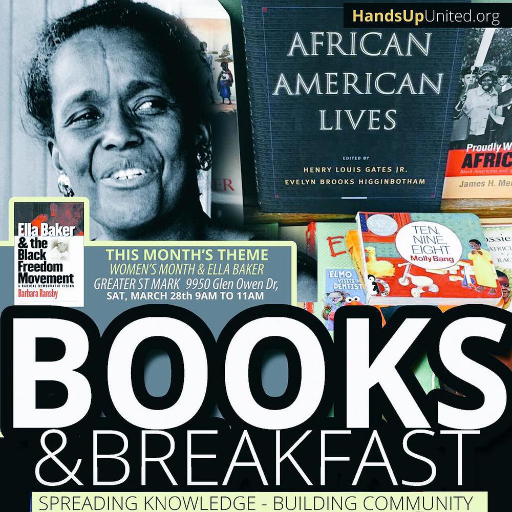 Books and Breakfast | March | Ella Baker Saturday, March 28, 2015 8:00am 10:00am 08:00 10:00 Greater St. Mark 9950 Glen Owen Dr St Louis, MO, 63136 United States This month's theme: Women's Month and Ella Baker. WHAT: Books and Breakfast, WHERE: Greater St. Mark, 9950 Glen Owen Dr. WHEN: 9AM to 11AM