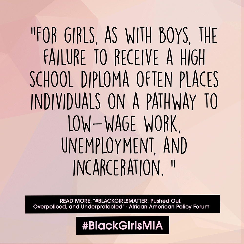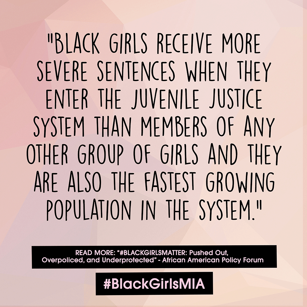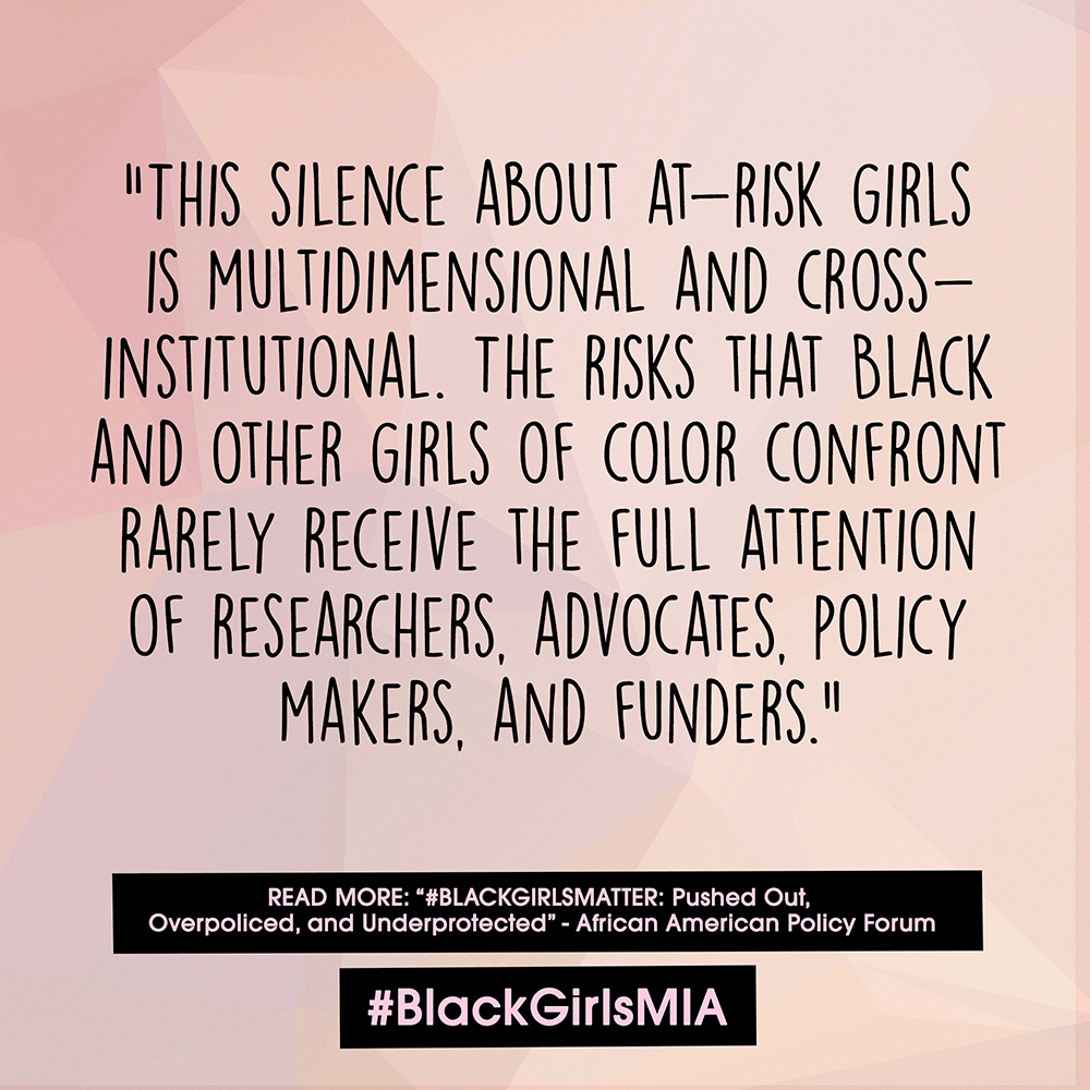 In a movement that has largely been built and sustained by the labor and dedication of Black women, seldom do we recognize their plight. Yes, Black girls are strong and magical, but we cannot continue to stand by ourselves in the fight for our humanity and everyone else’s. Black Girls are literally M.I.A –“Missing In Action”. Not in the sense that we are not putting our bodies on the line because black lives matter, we are, but because historically society has rarely taken our stories into account. In education, the economy, even in the retelling of Black history, Black girls are missing.